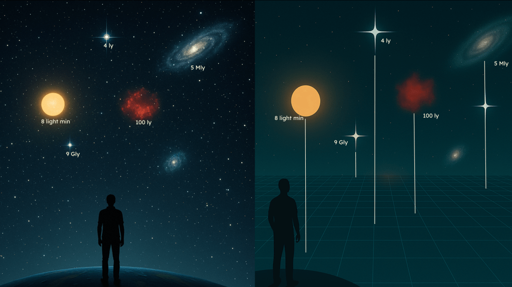 An example helps bring this more clearly into focus. Imagine the Sun. It’s about eight light-minutes away. So when you look up, you’re not seeing the Sun as it is now — you’re seeing an ever-evolving image of it with an eight-minute lag. The Sun right now — as it exists — is something different.