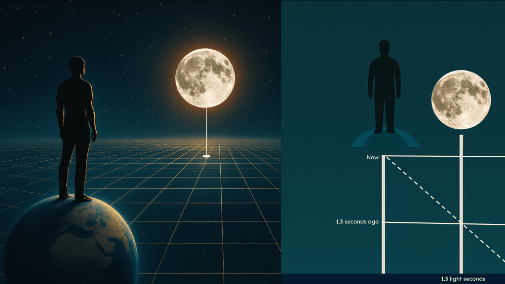 Just recall the last time you looked up at the Moon. It’s about 1.3 light seconds away. That means, as you stared at it, your eyes were receiving photons that left its surface 1.3 seconds earlier. Sunlight had reflected off the Moon, bounced into space, and finally reached your eyes.