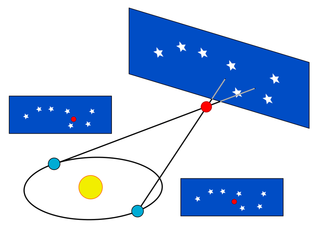 To see this, take your two eyes as representing the Earth’s position at six-month intervals, with your nose representing the Sun. Hold your thumb in front of your face and wink back and forth so you see your thumb shift with that change in position, just as a nearby star shifts when we move from one side of the Sun to the other.