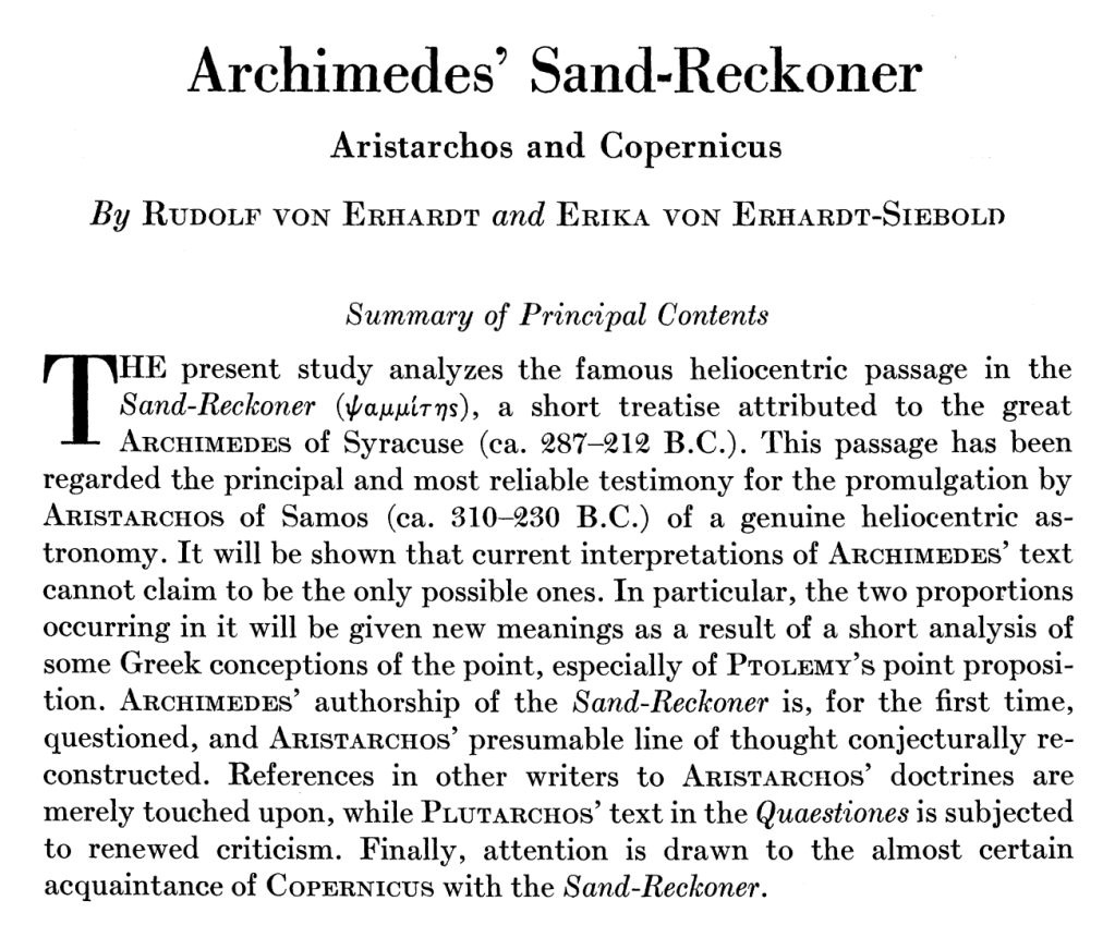 In 1942, Rudolf von Erhardt and Erika von Erhardt-Siebold published a sprawling article in the History of Science journal Isis, closing with a claim about “the almost certain acquaintance of Copernicus with the Sand-Reckoner.” In the article, this claim was buried at the end, and even there it was not well explained: The section is two paragraphs long, the point is made (without proper context) that Copernicus’s fourth postulate in Commentariolus is conspicuously similar in its construction to a passage from the Sand-Reckoner, and then the authors proceed to speculate—incorrectly!—that with this postulate Copernicus may have been guarding against the non-observability of stellar parallax due to Earth’s orbit.