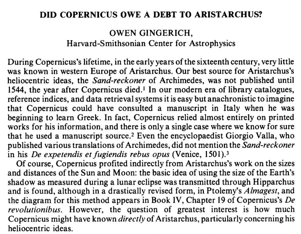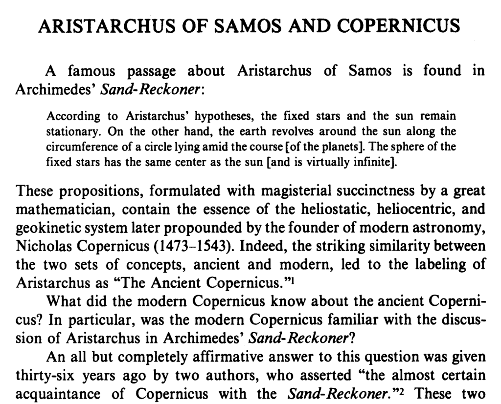 There, he began by essentially discarding the Sand-Reckoner as a possible text that Copernicus might have consulted, noted that there were in any case indirect connections between Aristarchus and Copernicus, but consolidated his focus to the question of “how much Copernicus might have known directly of Aristarchus, particularly concerning his heliocentric ideas.”