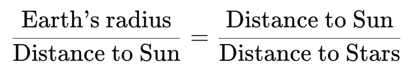In Aristarchus’s time, a generous constraint on the angular positions they were capable of measuring is ten arcminutes. Some accounts suggest that Aristarchus put the angular diameters of the Sun and Moon at two degrees rather than half a degree, which would imply a significantly larger measurement uncertainty than ten arcminutes. However, this seems unlikely, so we will go with a more generous constraint and imagine that Aristarchus might have been able to detect a ten arcminute shift in a nearby star’s position relative to its neighbours.
