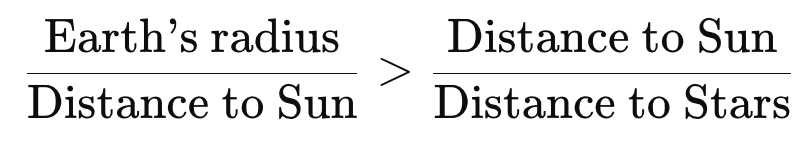 A measurement precision of ten arcminutes means the stars would have to be near enough to us that they would move back and forth by this amount at six month intervals as we orbit the Sun. This corresponds to a factor of 344 times the distance to the Sun. Therefore, if the closest stars were more than 344 times as far from Earth as the Earth is from the Sun, Aristarchus and his contemporaries could not have observed a parallax shift. At this same measurement precision, the Sun was already 1600 Earth radii away from Earth. With the Sun’s distance already so much greater than the Earth, a further factor of 344 in the distance to the stars would indeed be significant, though surely not enough to be considered “absurd” or “incredible.”