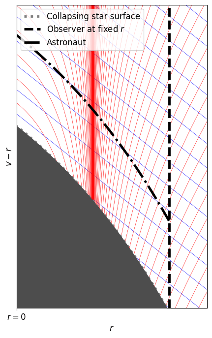 Only at the event horizon does the gap separating “the star’s surface at the moment that’s now being seen” and “the astronaut’s position now” finally become identically zero — so the time between emission and observation likewise goes to zero.