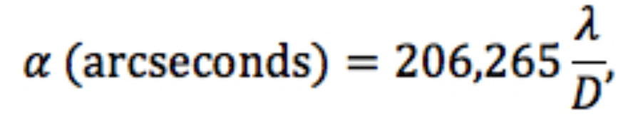 A telescope’s resolving power is given in terms of the smallest angular width that can be resolved. Therefore, as resolving power improves, its value decreases. When observing light with wavelength λ, a telescope whose primary mirror (or lens) diameter is D has a theoretical resolving power (in units of arcseconds) given by
