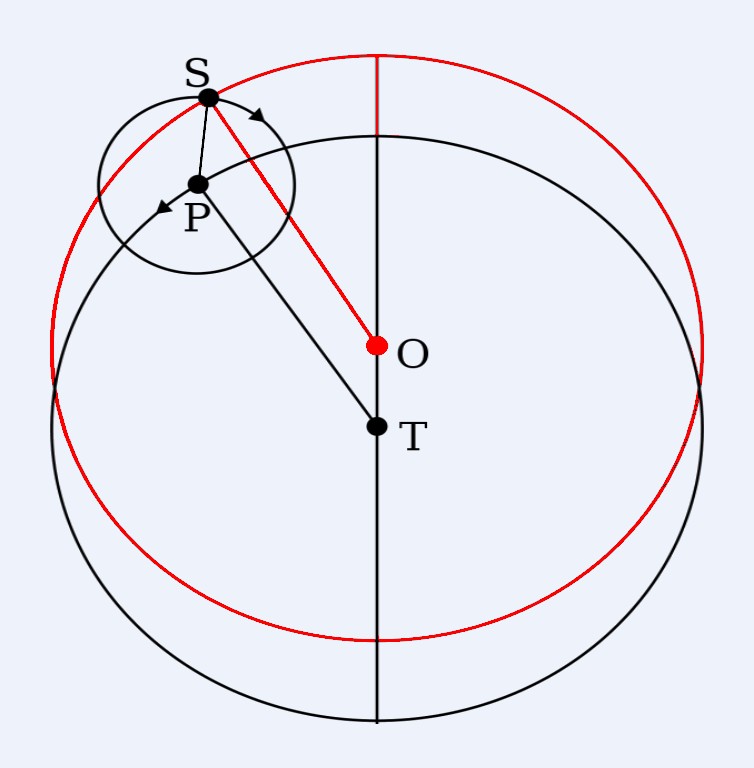 Figure 2-4: The equivalence of deferent-and-epicycle and eccentric orbits. (a) The orbit of S around T (the red circle) can be described equivalently as a circle centred about O, from which T is eccentric, or as the path traced out by S as it moves uniformly around an epicycle that moves uniformly along a circular deferent that is centred on T. Source.