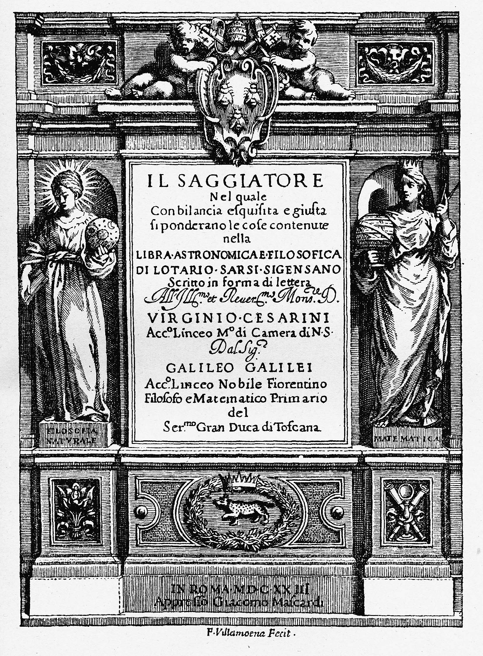 Galileo was a pioneer in experimental and mathematical physics, and for that work he is considered the father of modern science. His book The Assayer (see Figure 3-14), which was met with great acclaim, is now considered one of the pioneering works on the scientific method. In it, Galileo famously argued that experiment and mathematical formulation of scientific ideas should be upheld over reference to authority (i.e. to Aristotle). The Assayer was published in 1623, the same year that Galileo’s friend, Maffeo Barberini, became Pope Urban VIII.