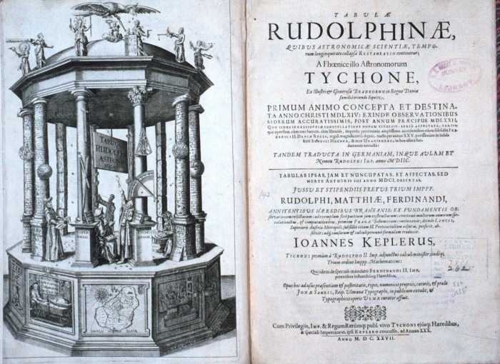 Having come up with his grand idea of the universe, Kepler was both anxious to share it with others and in need of a means to verify it. He sent many copies of the Mysterium Cosmographicum around Europe when it was printed in 1597, and one of the people he sent it to was Tycho Brahe. Although Tycho would never adopt Kepler’s theory, they corresponded over the next few years and, when religious tensions began to threaten Kepler and his family around 1600, Tycho invited him to Prague to be his assistant. As Imperial Mathematician, Tycho’s main task was to produce an updated set of astronomical tables, to be called The Rudolphine Tables after the Holy Roman Emperor Rudolph II, which he intended to base upon his own geo-heliocentric system. Tycho died unexpectedly less than two years later and Kepler succeeded him as Imperial Mathematician, inheriting all of Tycho’s observational data as well as the task of producing The Rudolphine Tables.