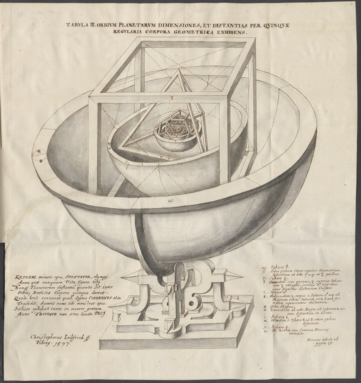 Two years before Tycho’s move, in 1595, Kepler came upon an idea that would guide his research for the rest of his life: from that time on Kepler believed that the Aristotelian spheres in which all six planets (that is, Mercury, Venus, Earth, Mars, Jupiter and Saturn) should orbit the Sun, were nested between a series of five Platonic solids—the octahedron, icosahedron, dodecahedron, tetrahedron and cube. The Platonic solids (named after Plato) that Kepler thought of as the key to unlocking the cosmic mystery, are the only three-dimensional shapes with the properties that